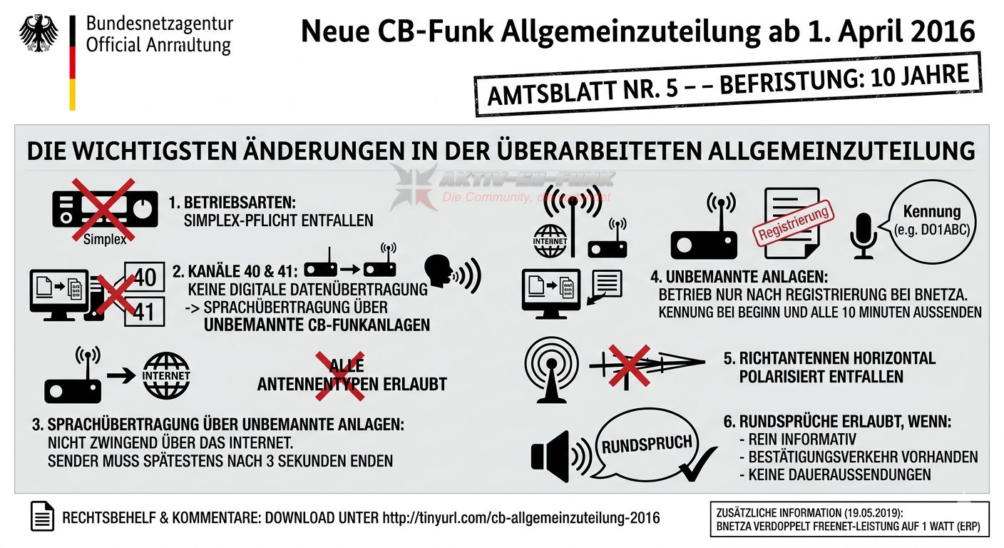 Die Bundesnetzagentur hat am 16. März 2016 in ihrem Amtsblatt Nr. 5 eine neue Allgemeinzuteilung für den CB-Funk veröffentlicht. Die neue Allgemeinzuteilung tritt am 1. April 2016 in Kraft. Sie ist - wie üblich - auf zehn Jahre befristet.